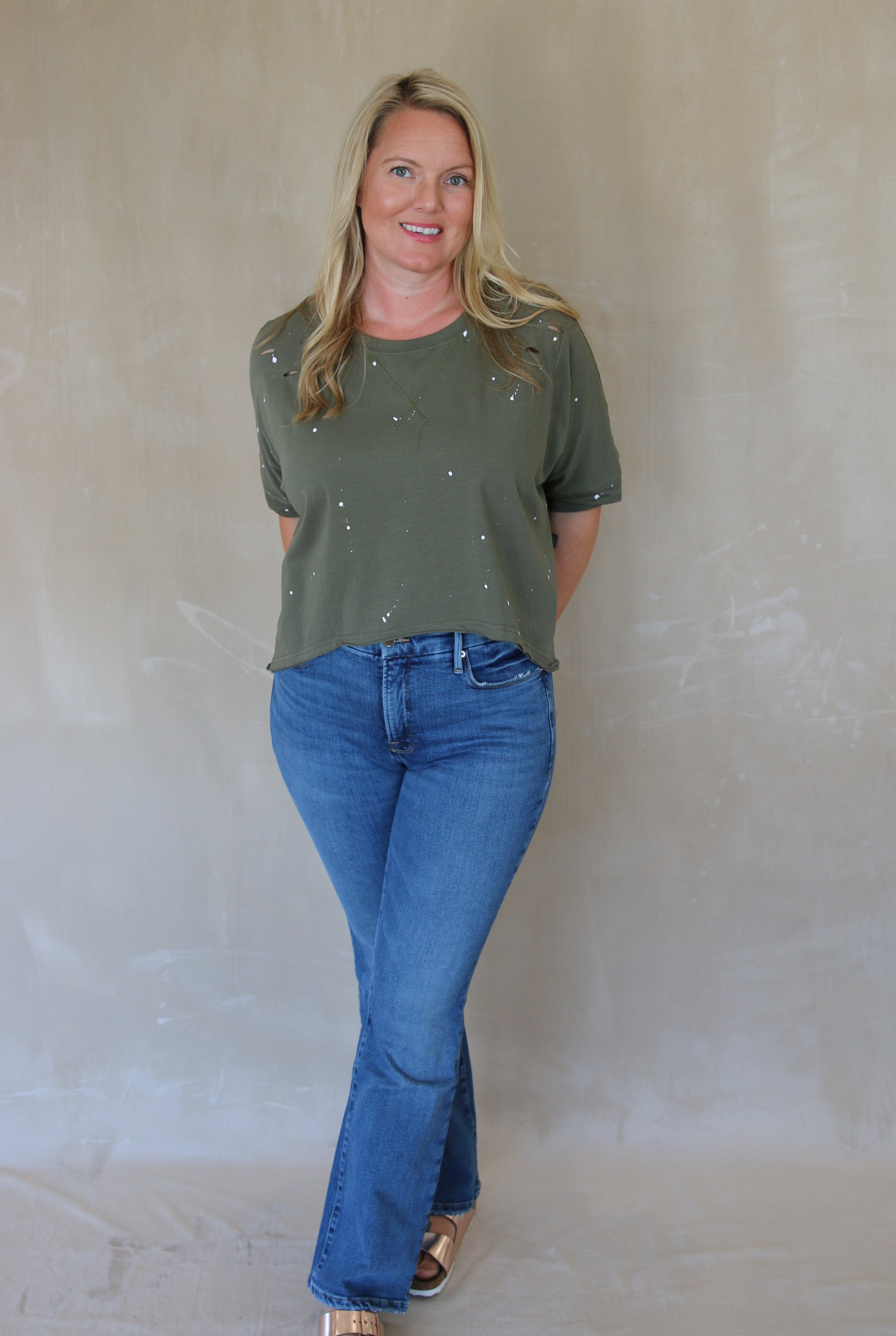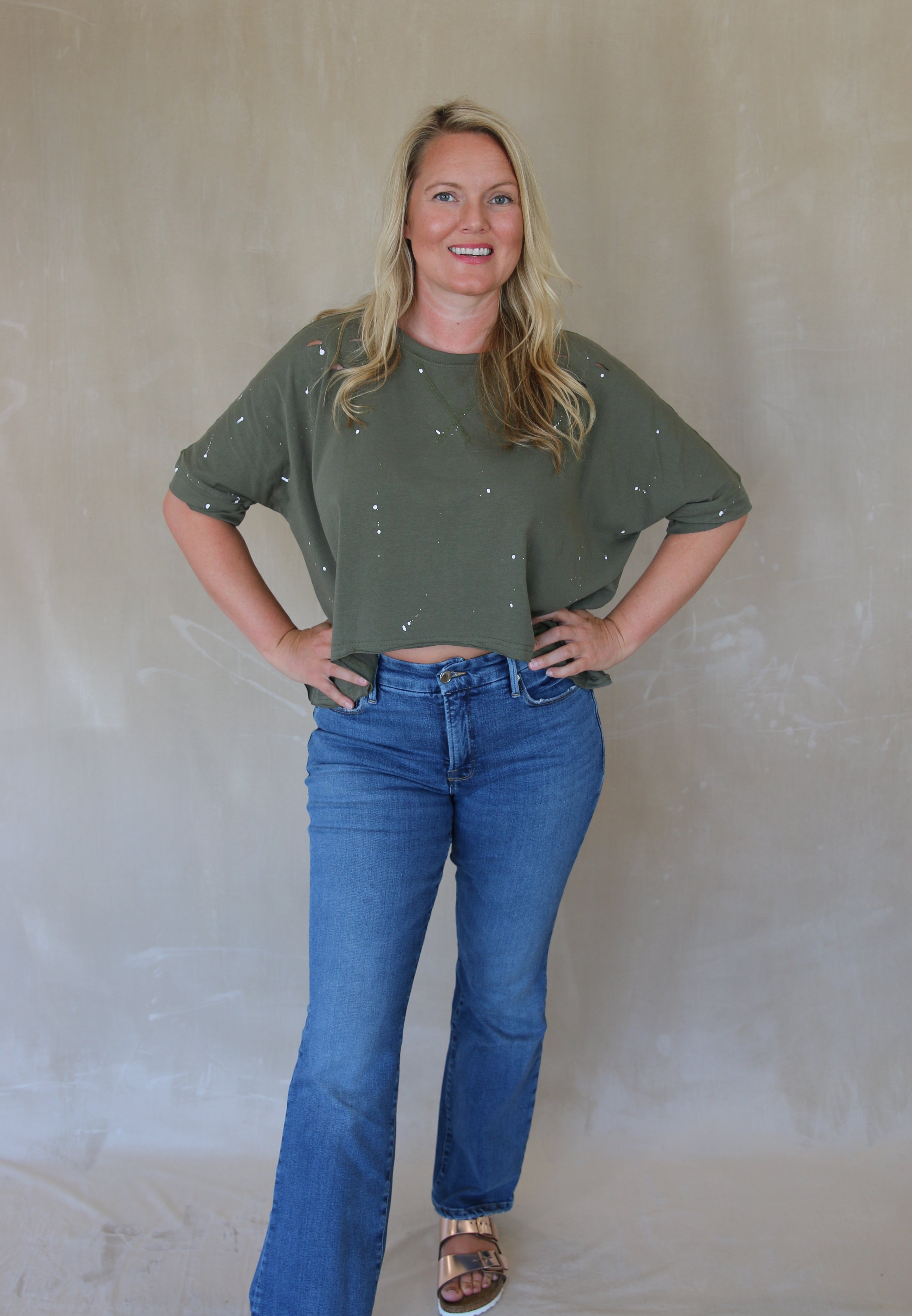 Distressed Bleached Asymmetric Hem Short Sleeve Top