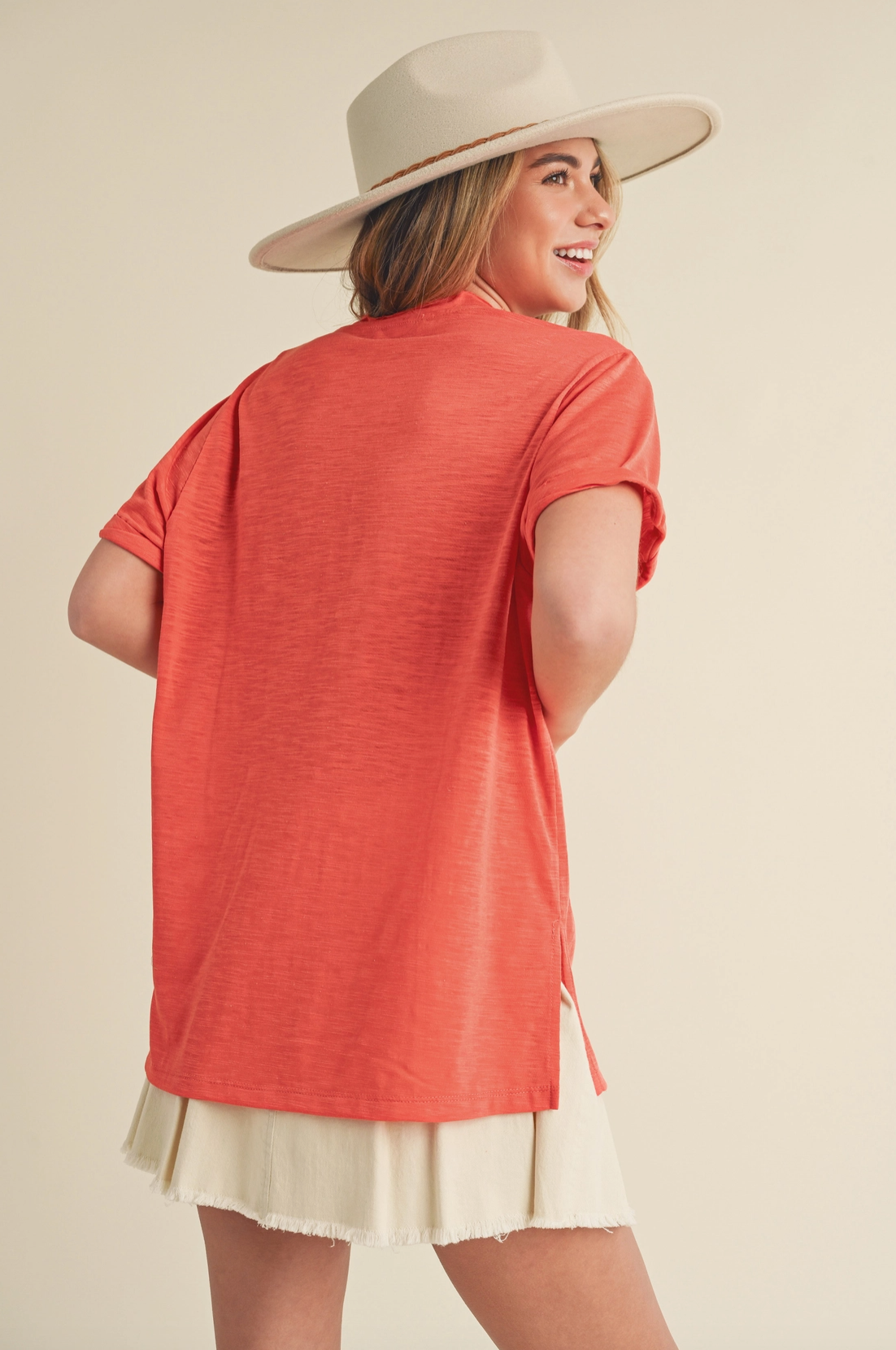 Rolled Sleeve V-Neck Pocket Tee - Coral