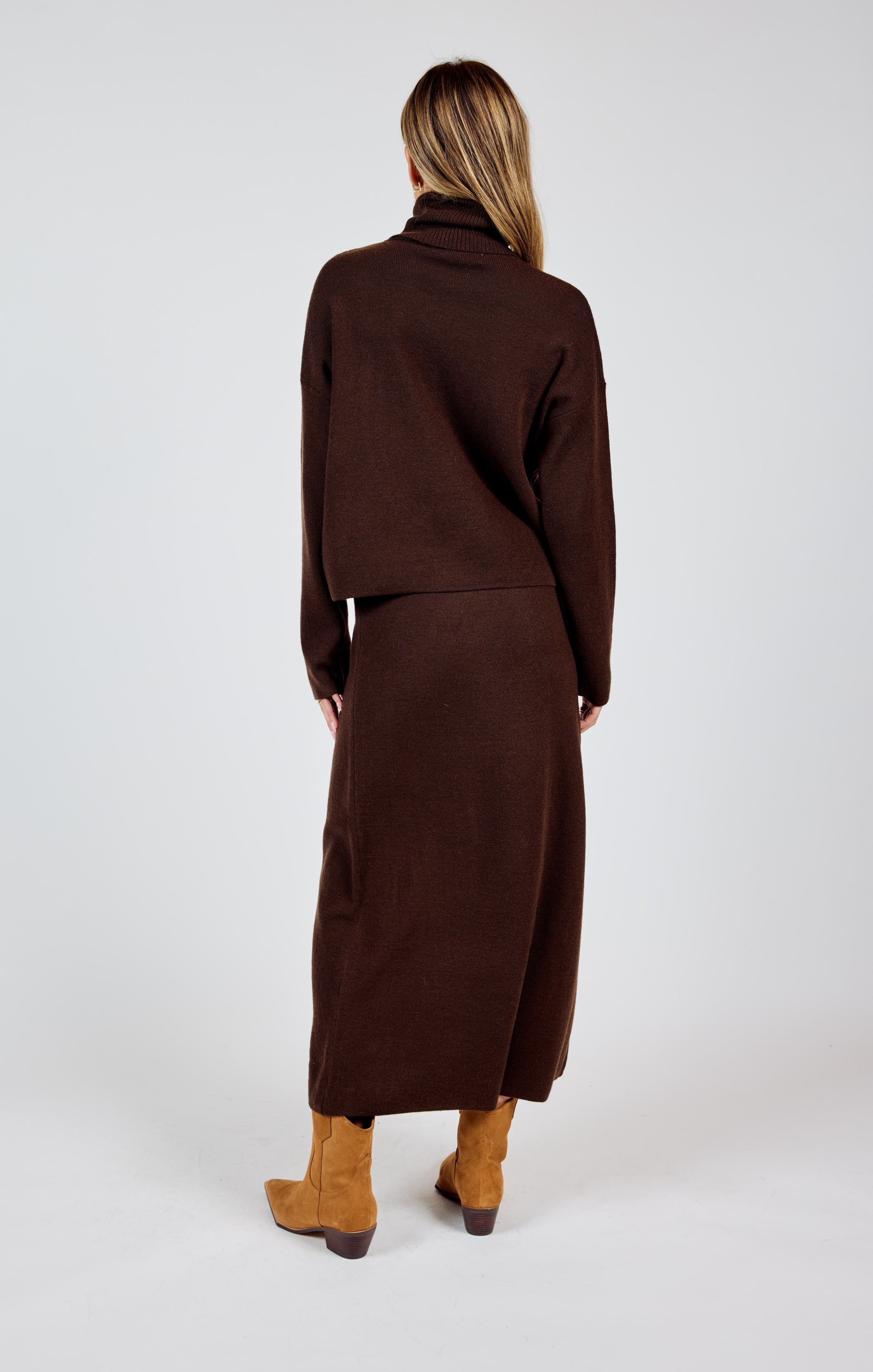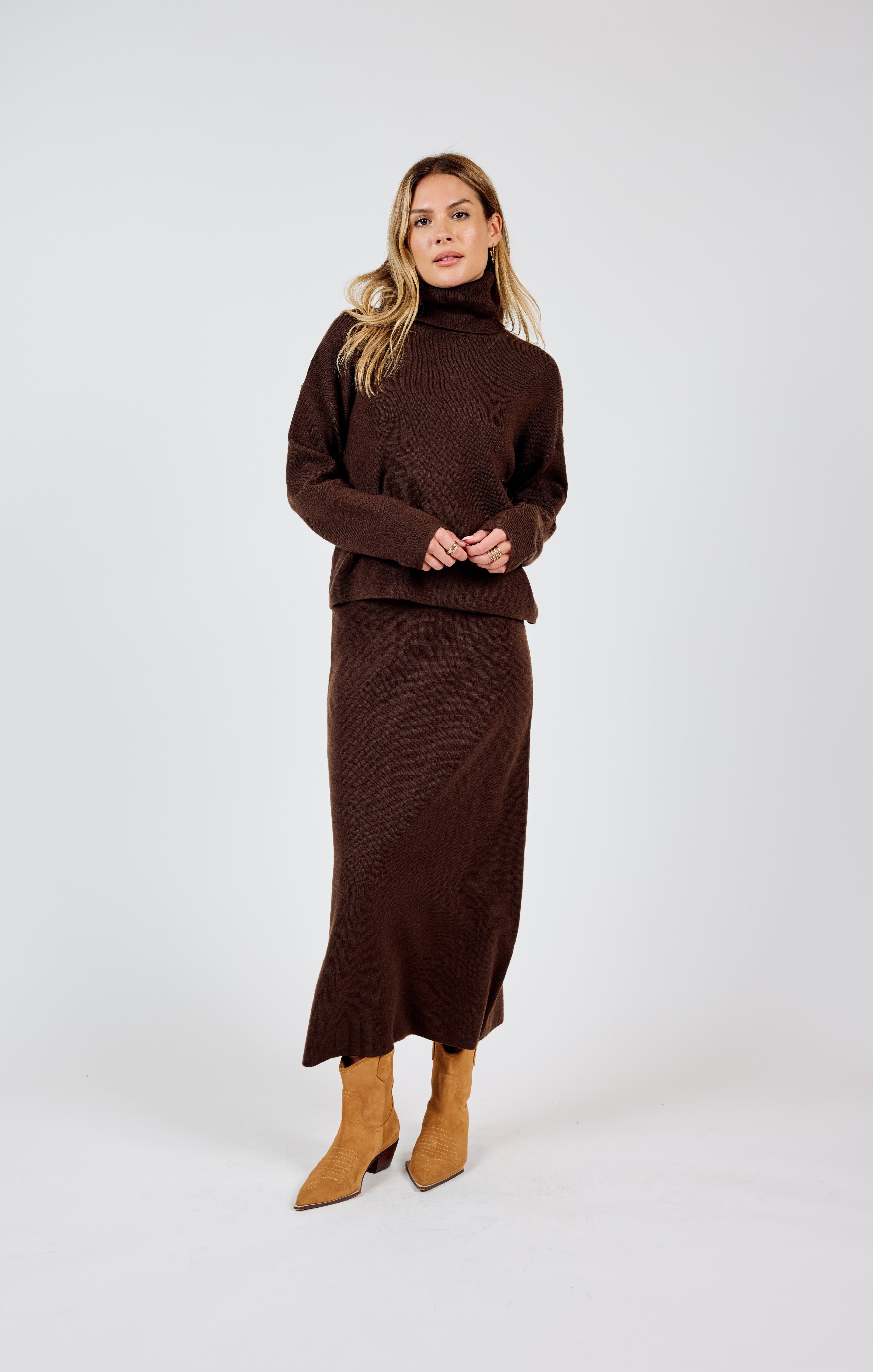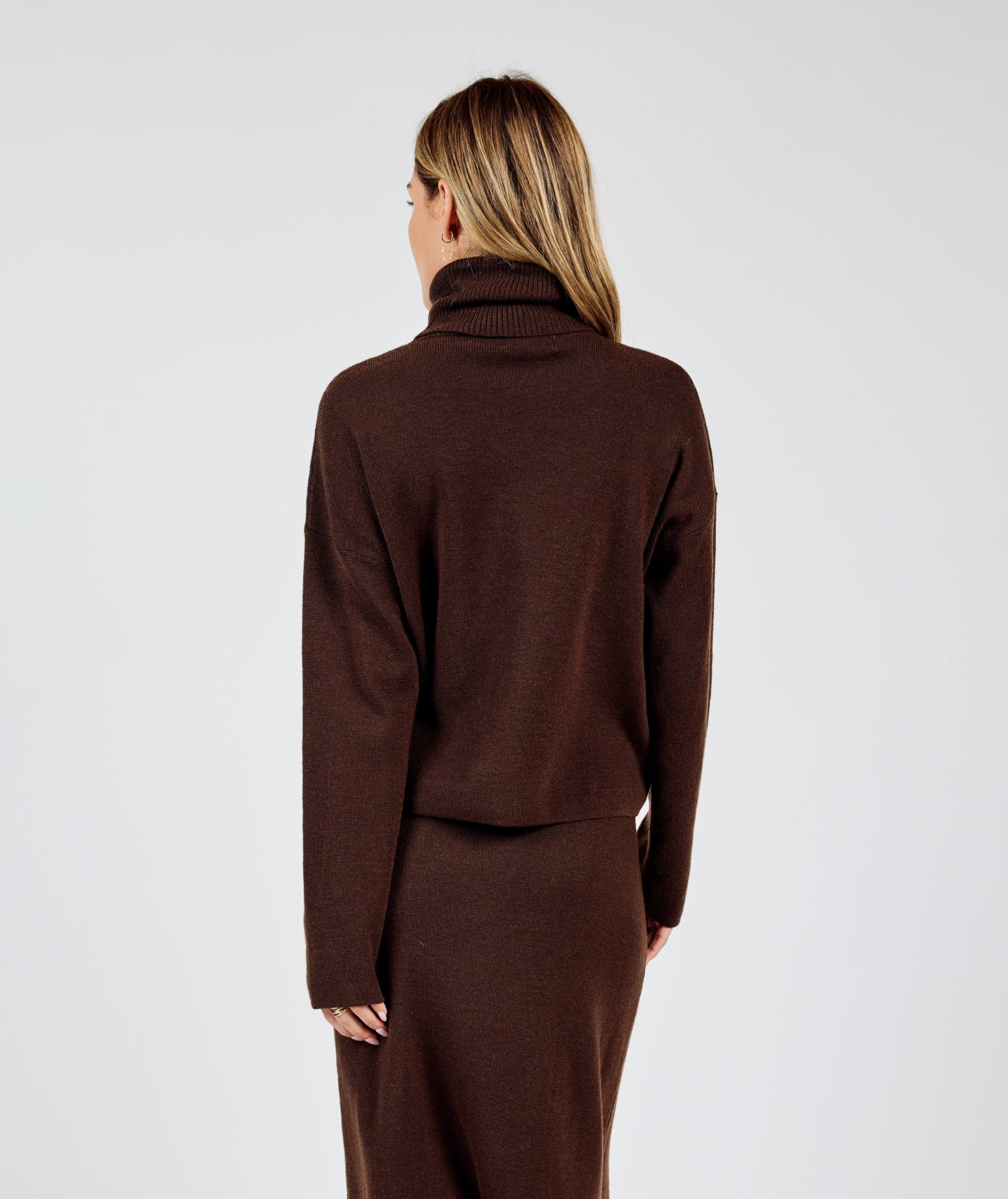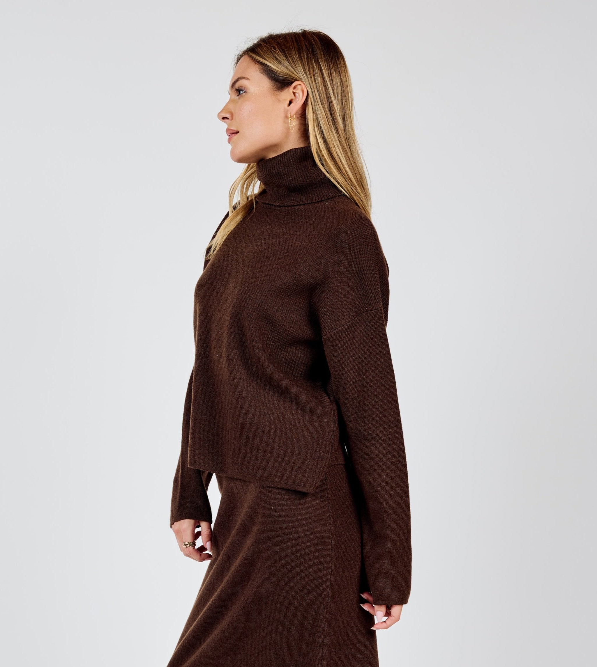 Embrace the cooler months with our Night Air Turtleneck Sweater, a staple piece designed for both warmth and style. This sweater features a high, fold-over turtleneck and a relaxed fit that makes it an essential for any winter wardrobe. Its rich, deep brown hue exudes a sense of sophisticated warmth, making it versatile for both casual and formal settings.