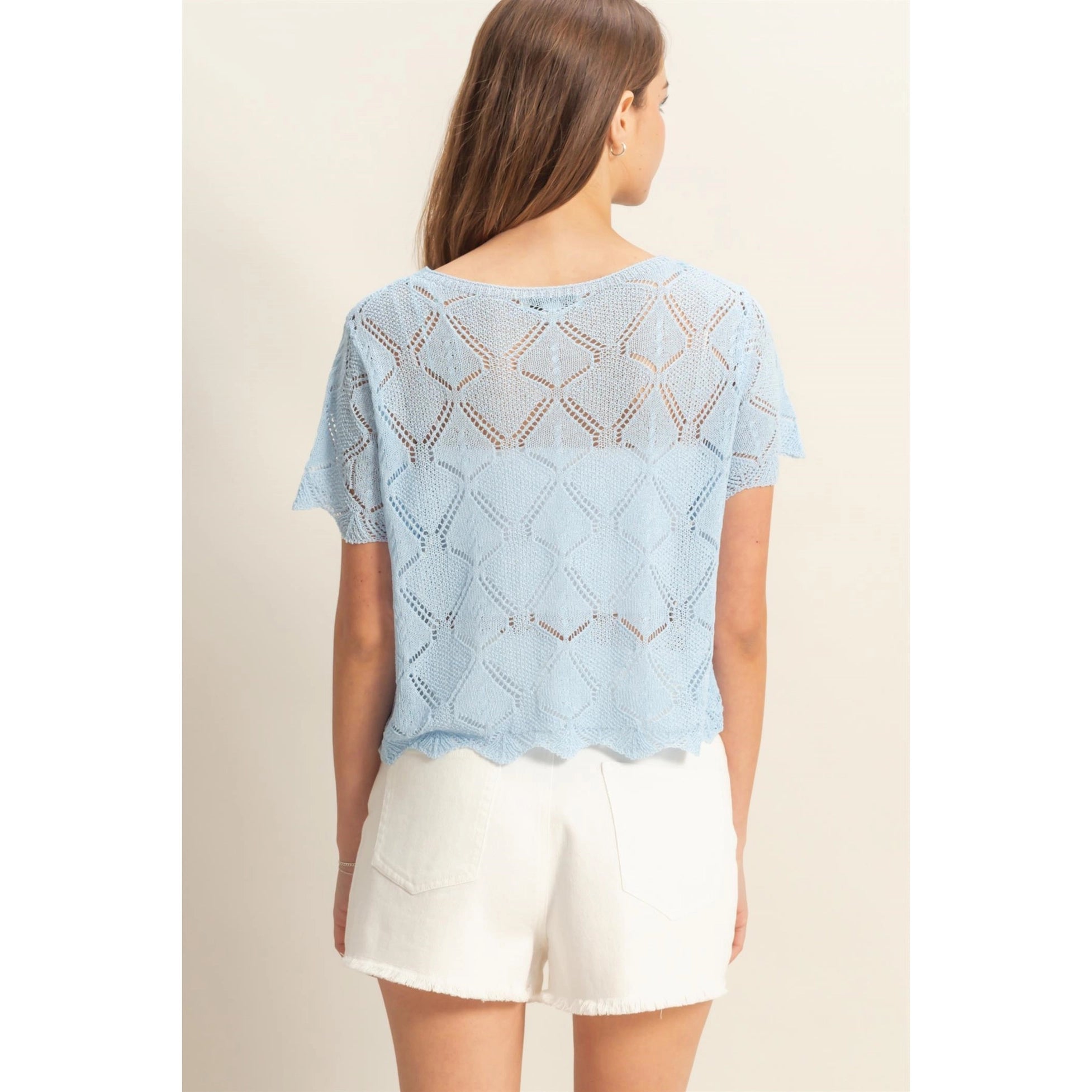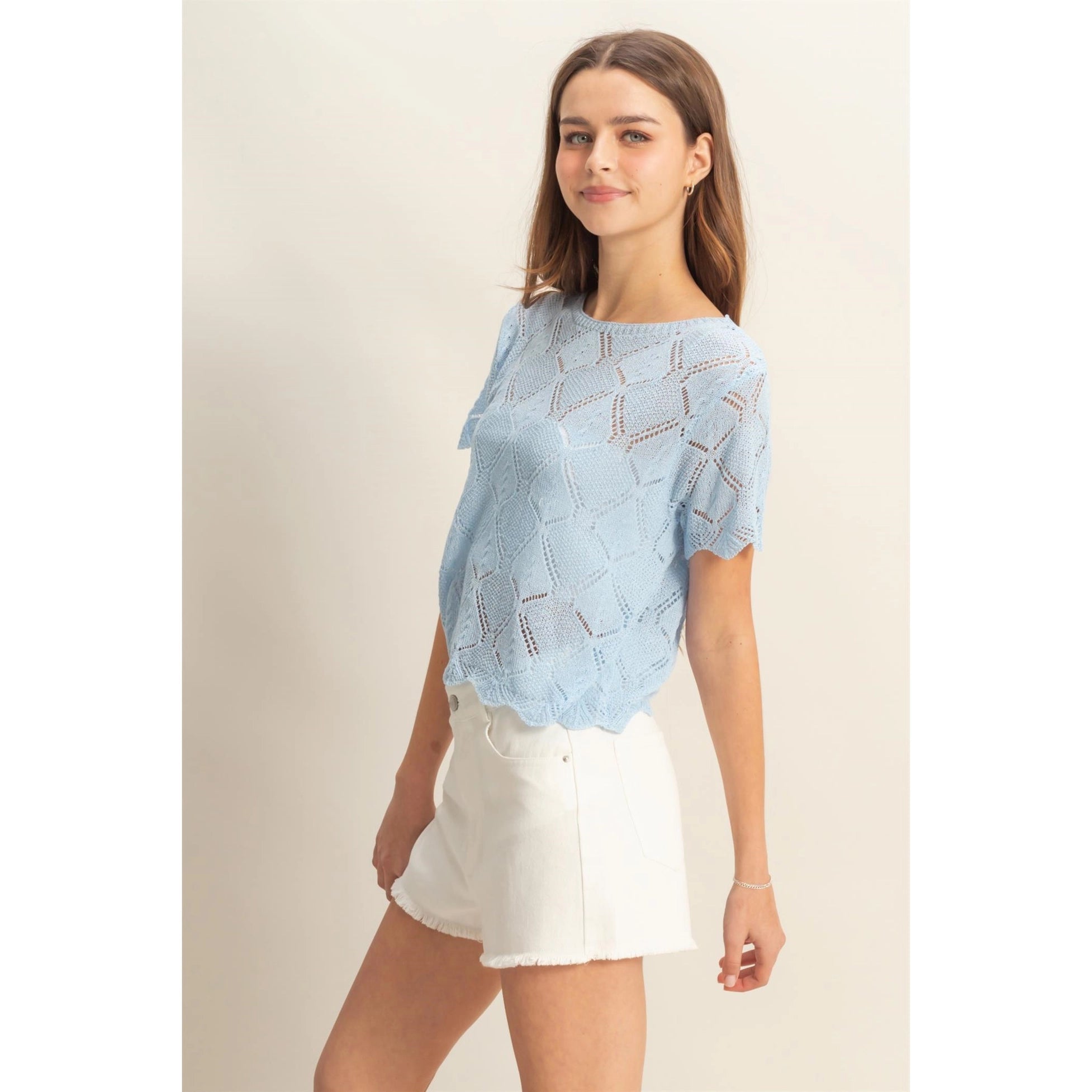 A little sweet, a little coastal, and endlessly wearable—The Skyview Crochet Tee is your go-to for airy, laid-back style. Designed with an open-stitch knit and scalloped hem, this short sleeve top features a subtle boat neckline and relaxed fit that’s easy to pair with just about anything.