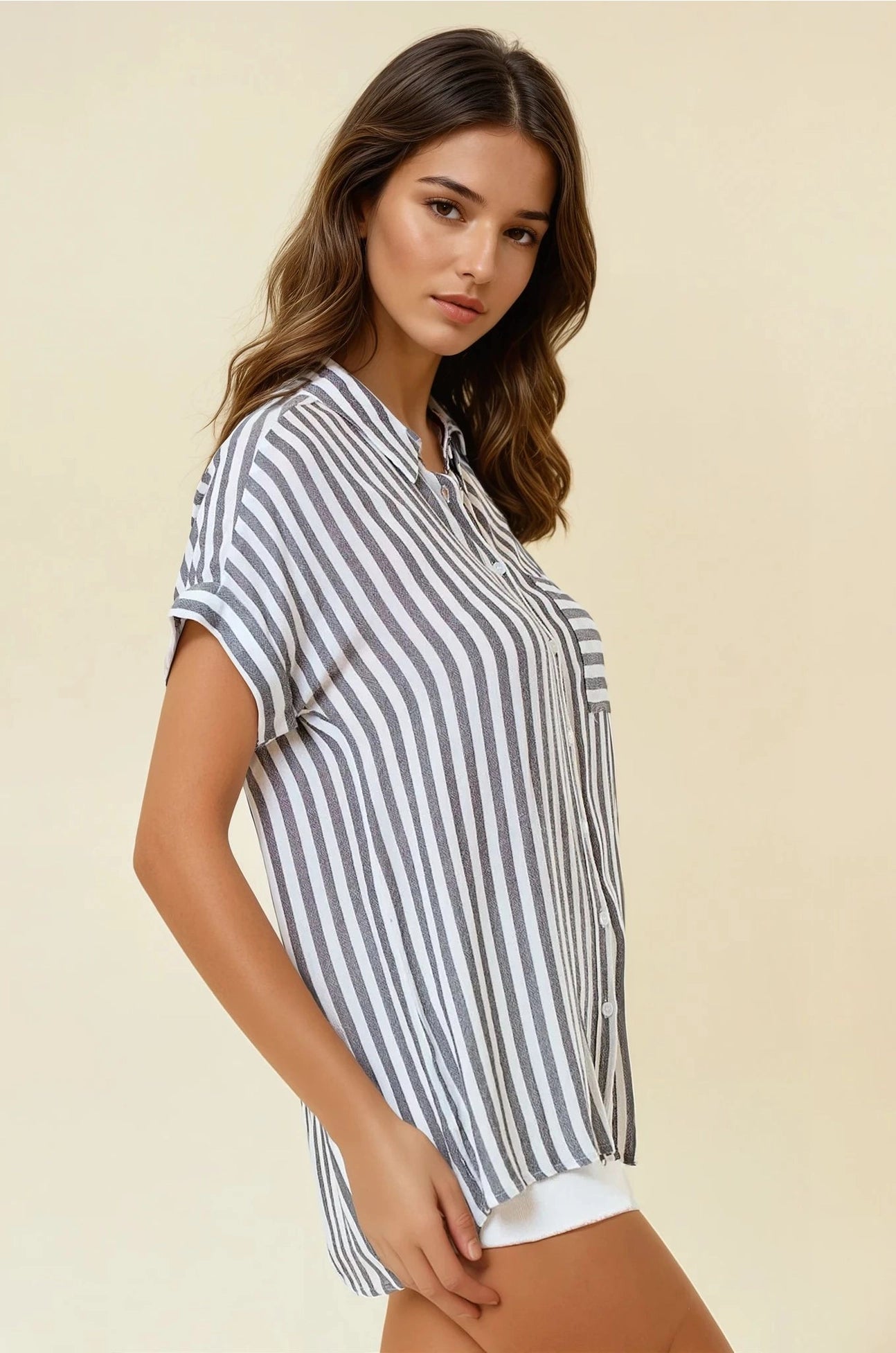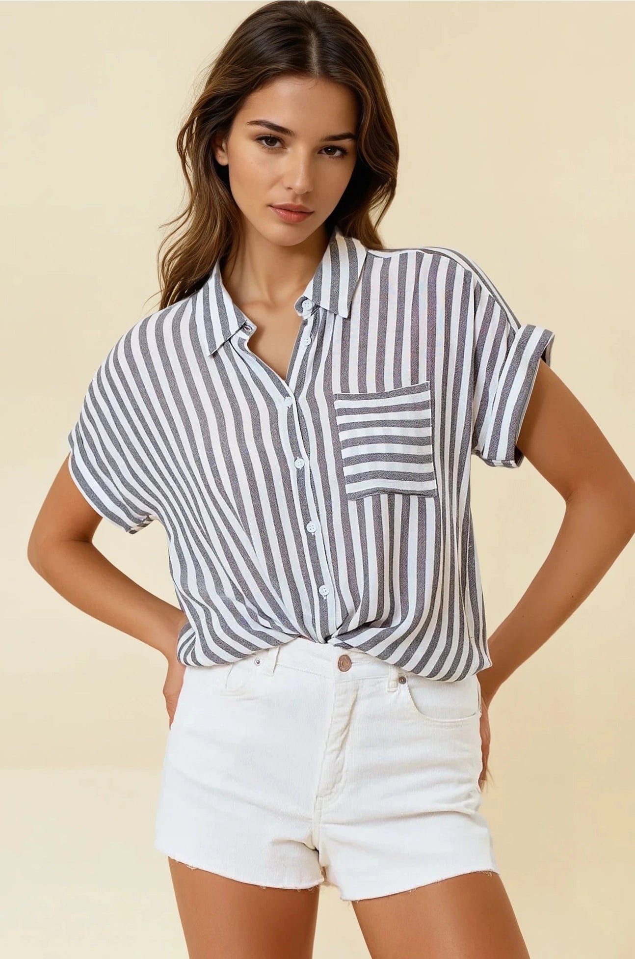 Easy like a seaside morning, the Driftline Button-Up brings breezy polish to your everyday style. Designed with bold vertical stripes and a lightweight feel, this short sleeve shirt features a relaxed fit, rolled cuffs, and a classic button-down silhouette. The chest pocket flips the stripe direction for a subtle, playful contrast.