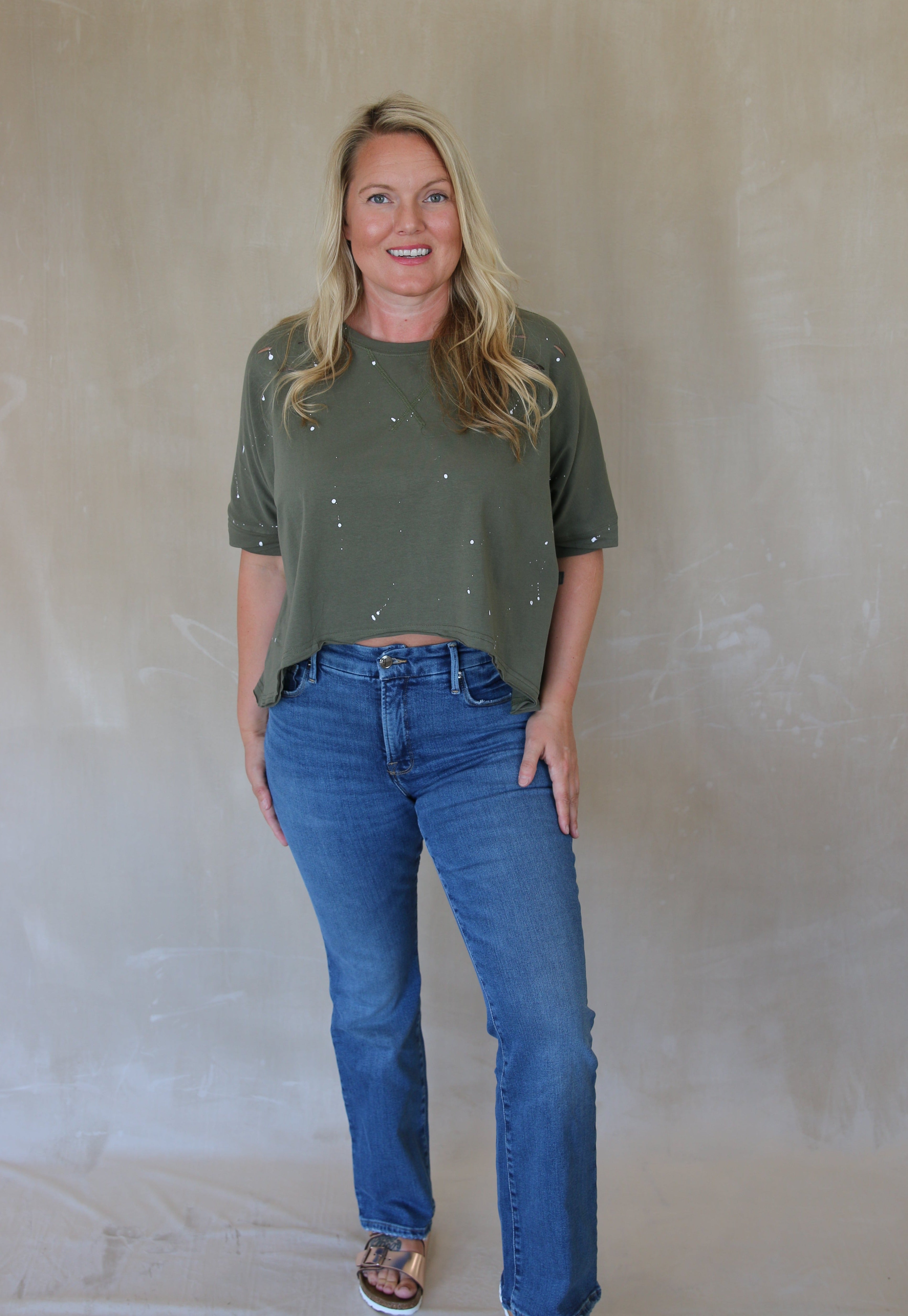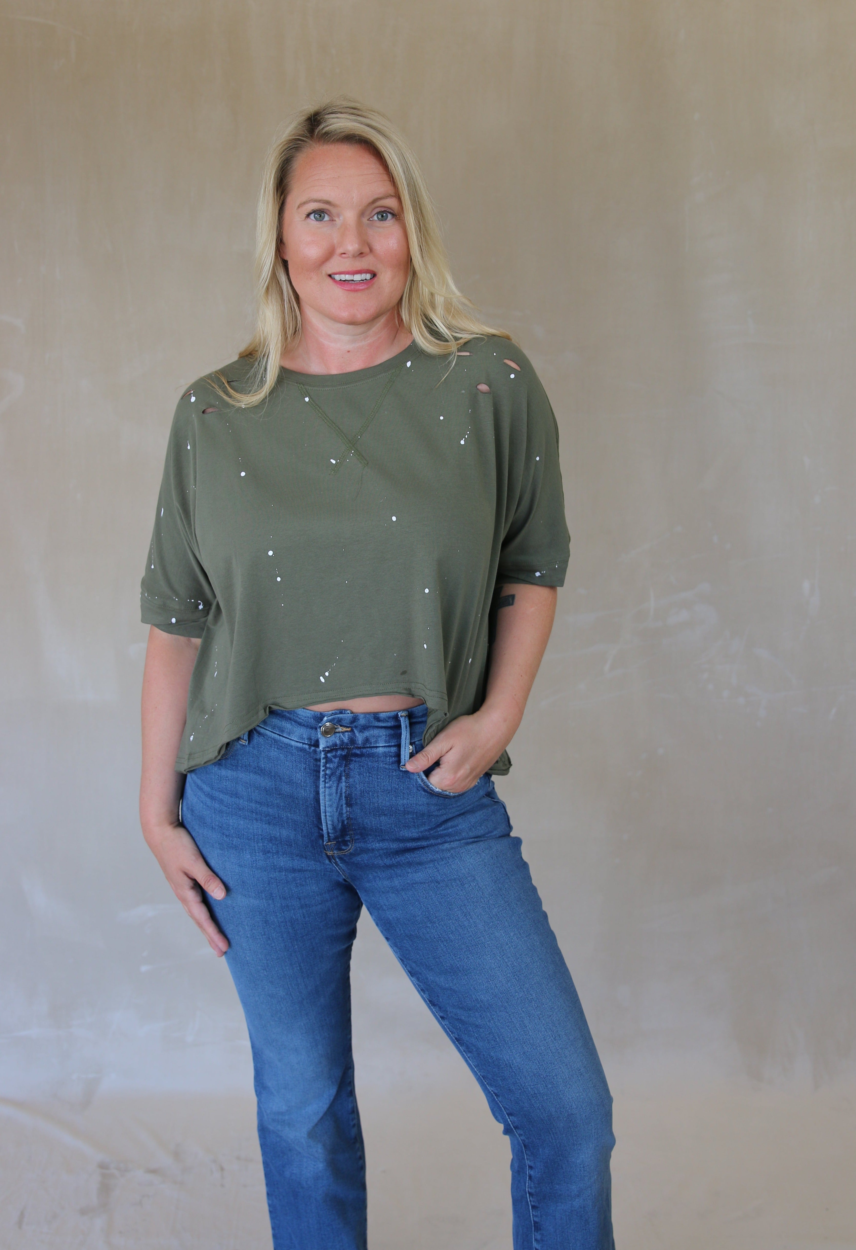 Introducing our Distressed Bleached Asymmetric Hem Short Sleeve Top – a trendy and edgy addition to your casual wardrobe. Embrace the laid-back vibes and contemporary style of this unique and eye-catching piece.