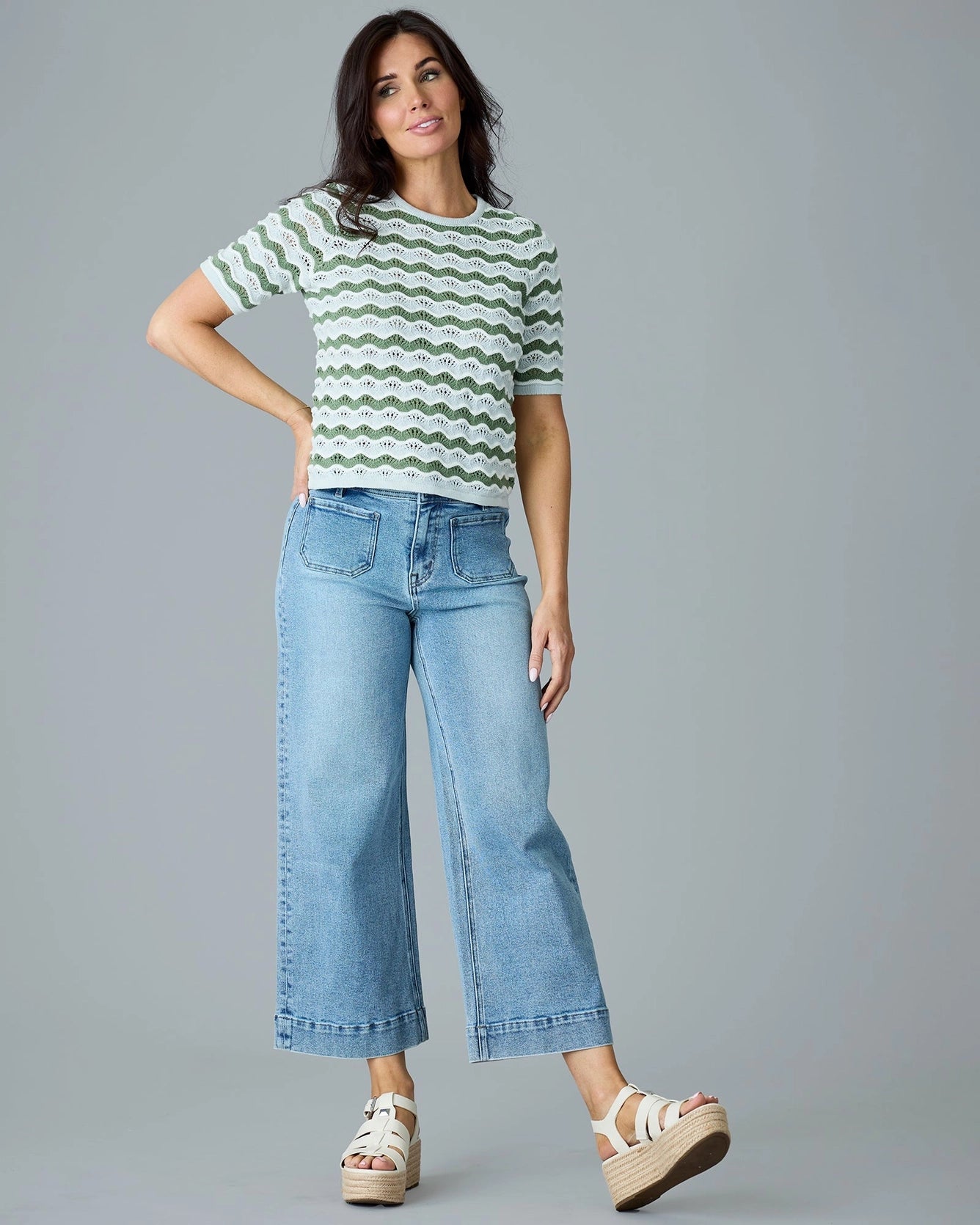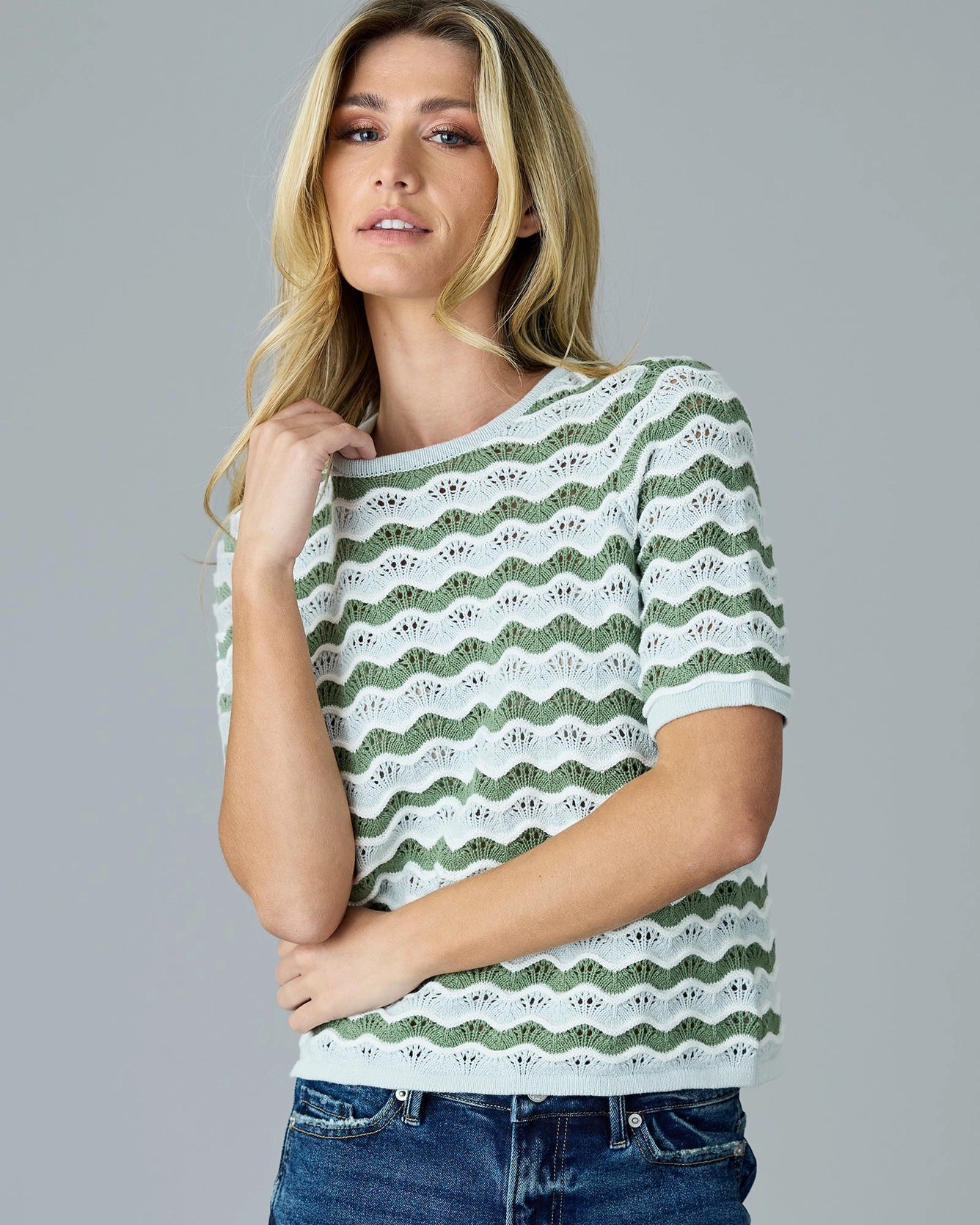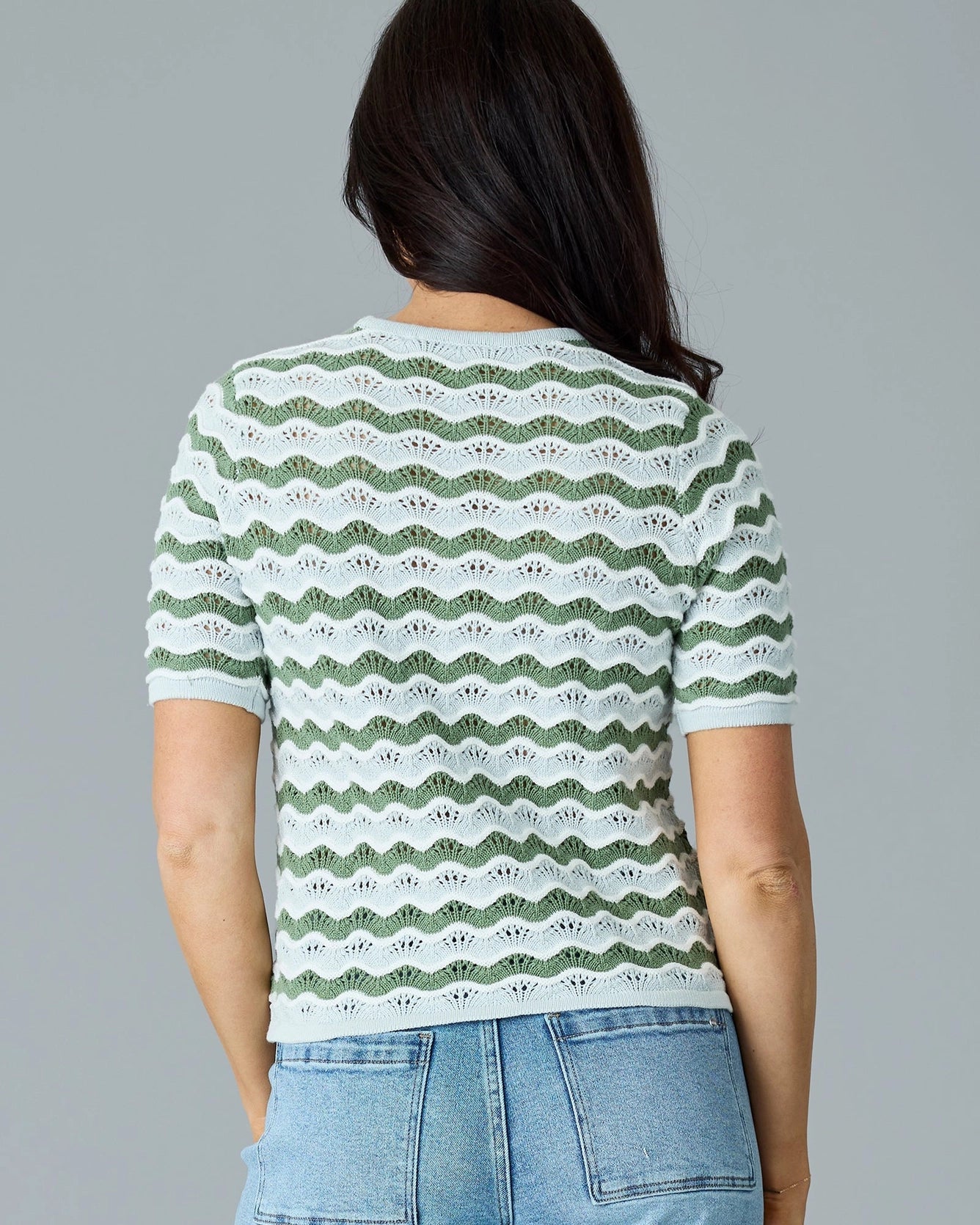 Embrace casual elegance with the High Tides Sweater. This short sleeve pullover features an open knit design, perfect for layering or wearing on its own. The wavy striped pattern adds a touch of sophistication and charm, making it a standout piece in any wardrobe.