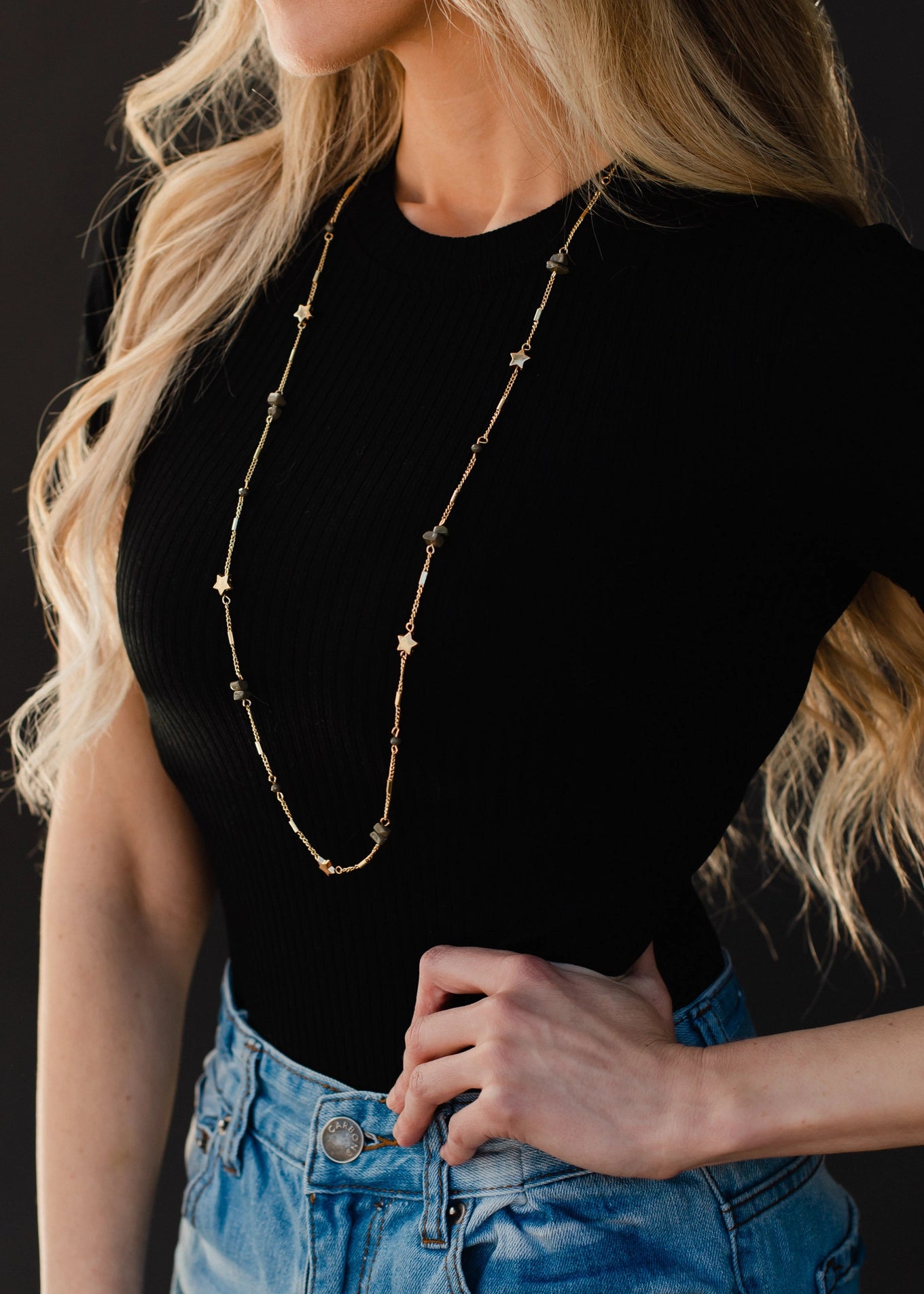 Add a celestial touch to your ensemble with this gold featuring delicate grey beaded details and charming gold star accents, this piece effortlessly combines elegance and whimsy.