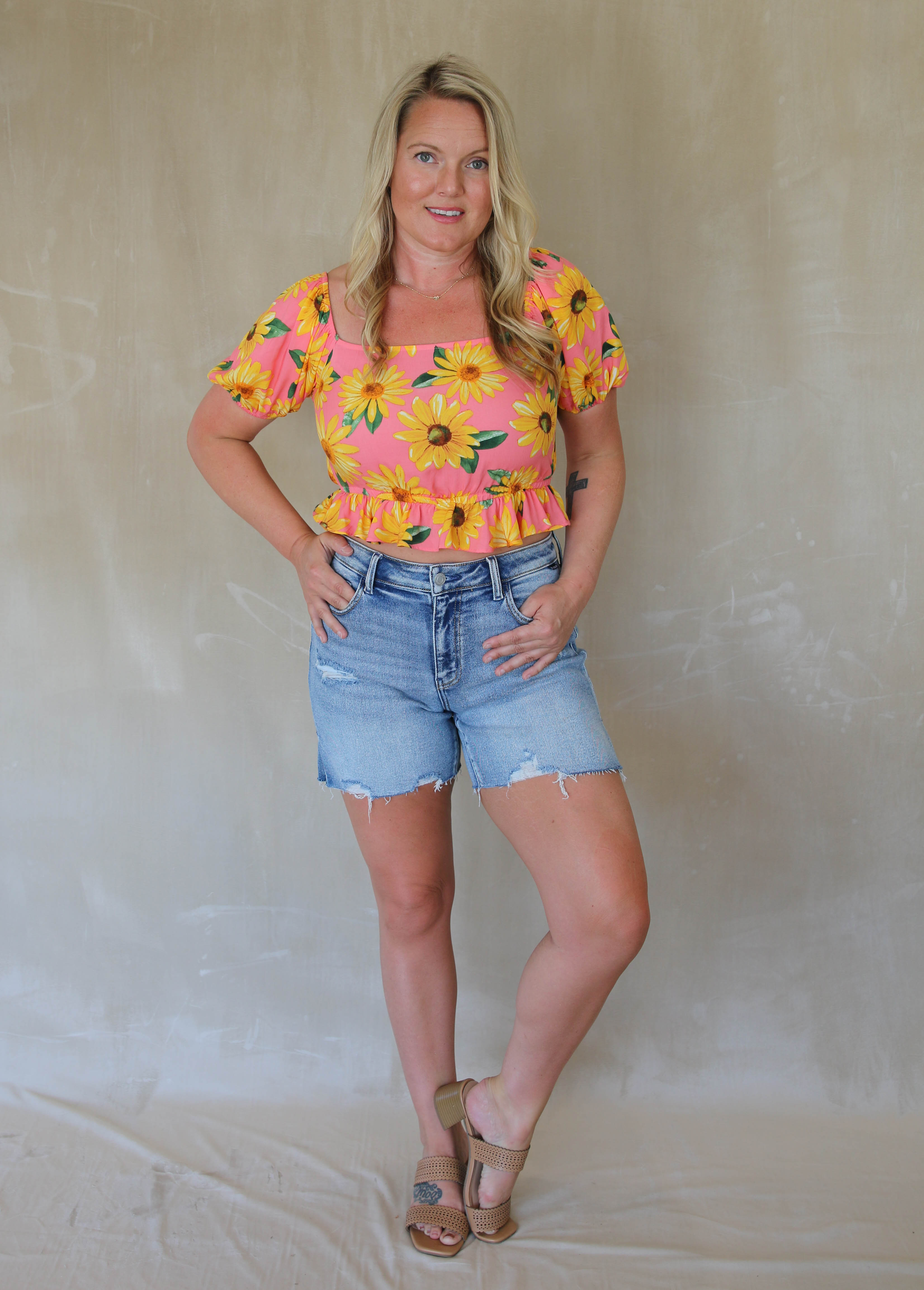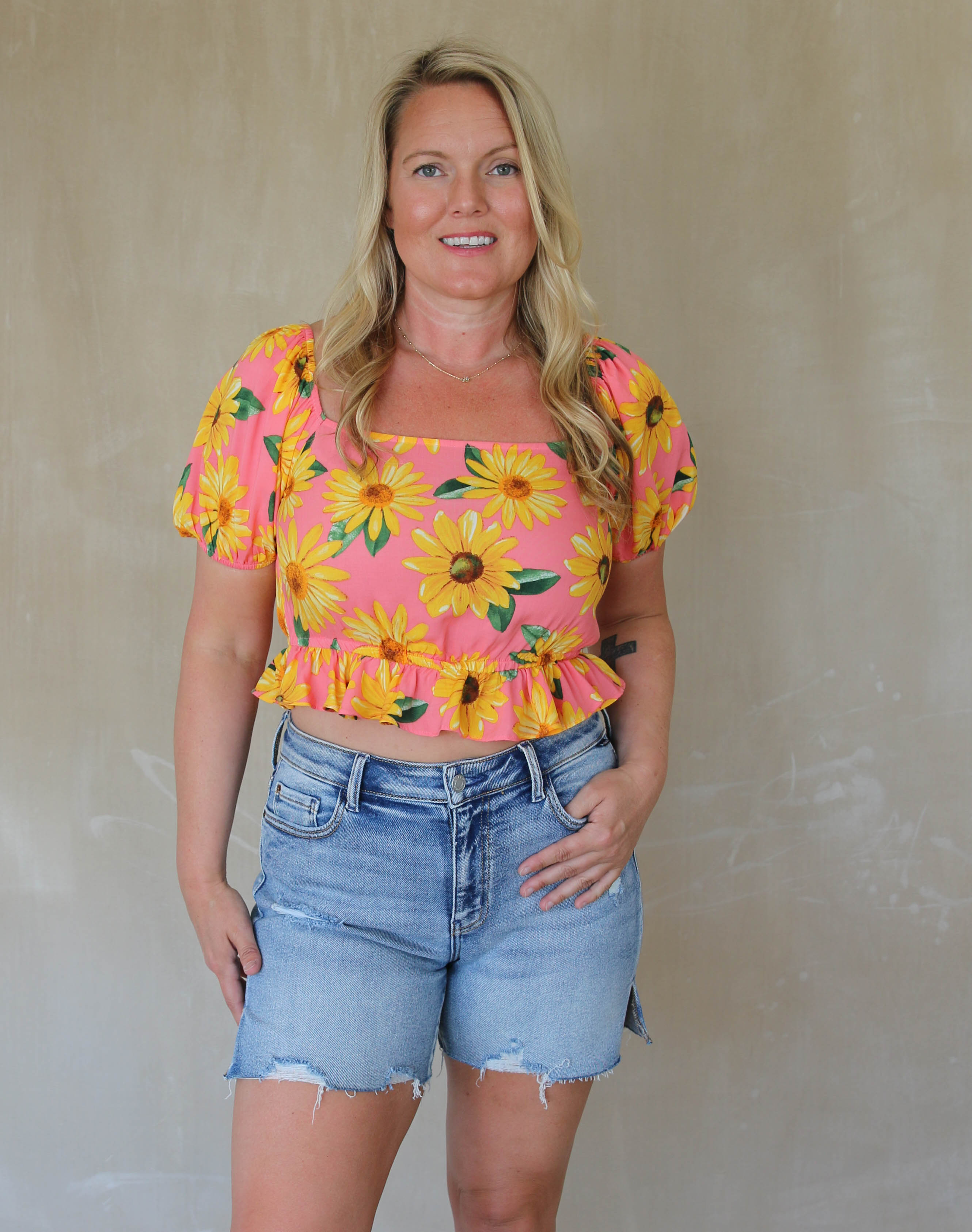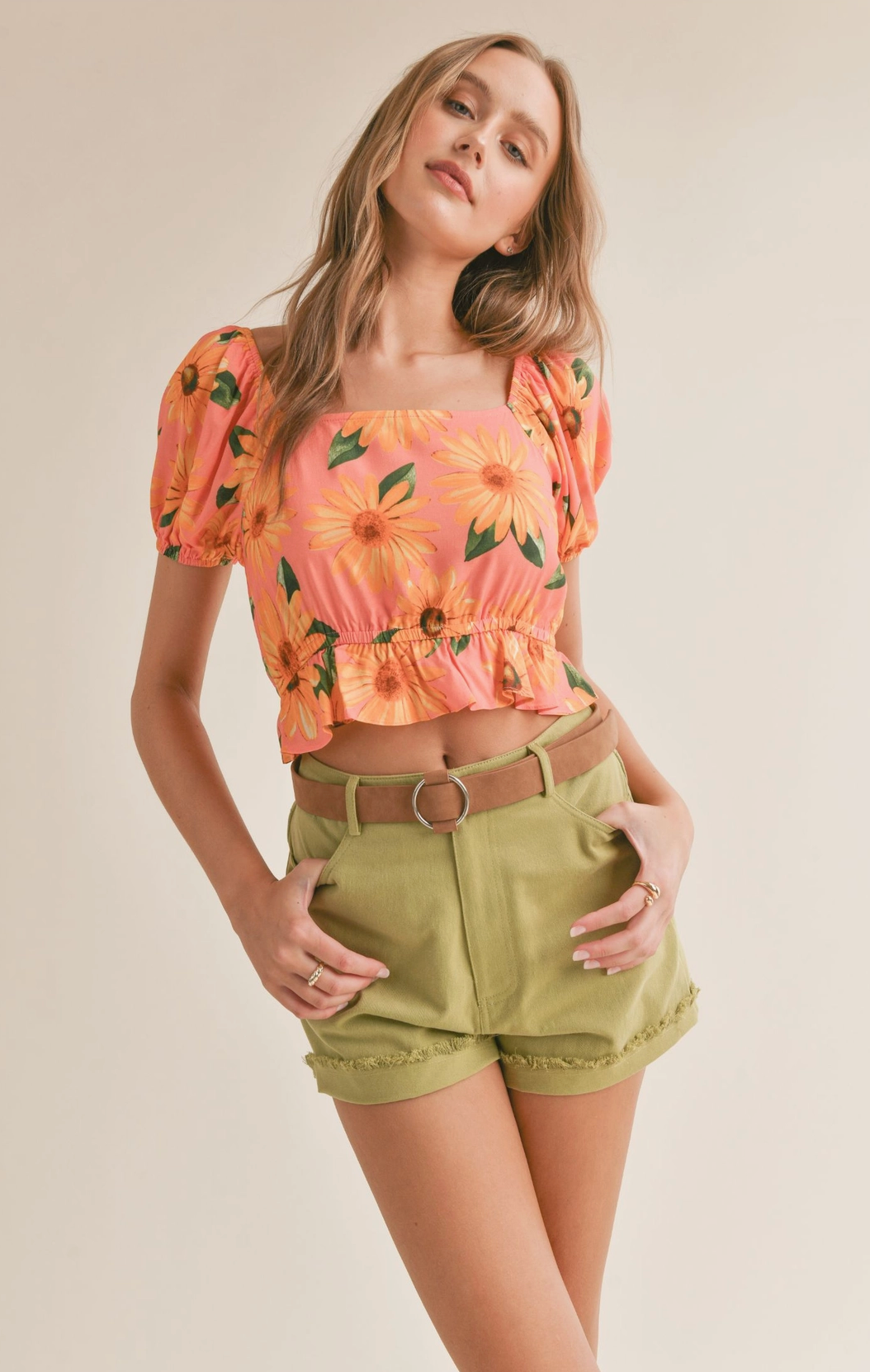 Complete with a delicate ruffled hem, this crop top exudes feminine elegance, perfect for pairing with high-waisted bottoms for a chic and trendy ensemble.